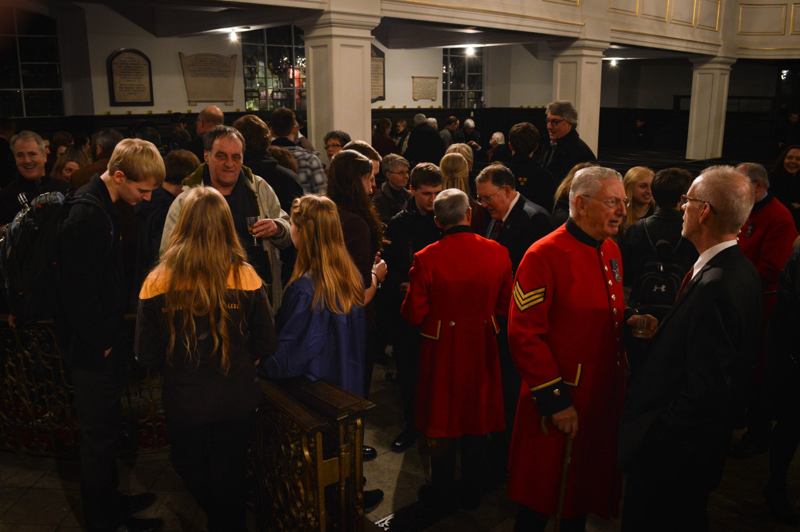 The Grosvenor audience was a lovely mix, featuring the companion tour, staff from Sovereign Tours (the fabulous company managing the tour), a group of theatre students from Drake University, a Gustavus alumnus currently living in Germany, and four distinguished British war veterans in full military regalia. These veterans are “Chelsea Pensioners,” a select group of decorated servicemen from World War II onwards who reside together in a retirement community in London. In a reception after the concert, these friendly and venerable veterans shared their stories with the tour group. One of the Pensioners, a Scotsman, was moved to tears by the choir’s performance of the traditional Scottish ballad “Loch Lomond.”